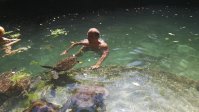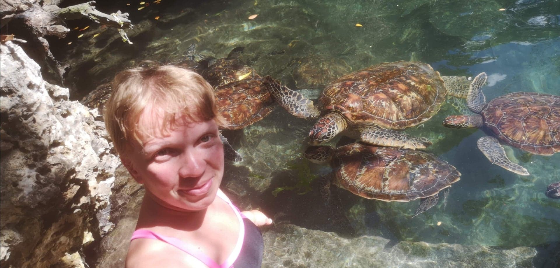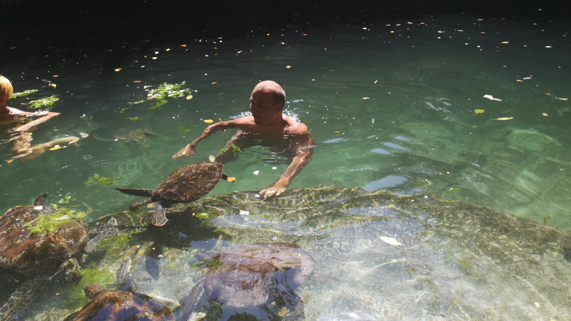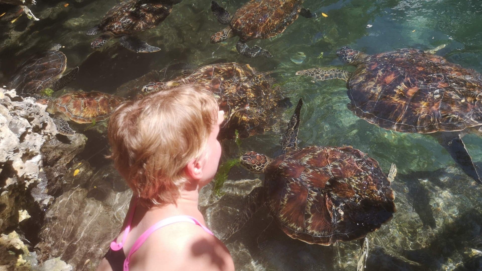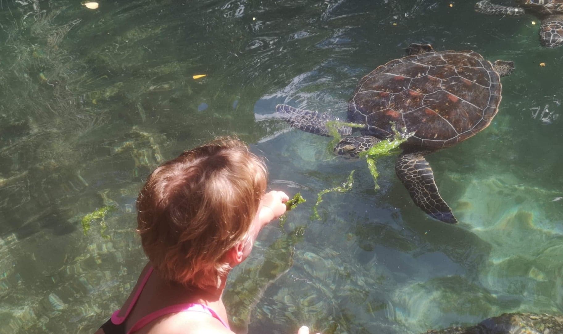 Jak dowiedzieliście się z wcześniejszych moich wpisów, atrakcją Zanzibaru są m.in. żółwie olbrzymie, z kolei od niedawna dołączyły jeszcze żółwie wodne. To właśnie w 2017 roku mieszkańcy Nungwi otworzyli w lagunie otoczonej koralowcami rezerwat żółwi wodnych, zwany Baraka Aquarium. Gady te trafiają tam po uwolnieniu z sieci rybackich zakładanych przez kłusowników. W Baraka Aquarium goją się ich zranienia i kiedy zwierzęta osiągną odpowiednie rozmiary, wypuszczane są z powrotem na wolność do oceanu. Odwiedzający tą niewielką lagunę mogą cieszyć się nie tylko możliwością zobaczenia czy też karmienia tych pięknych, rodzimych gadów, ale również pływać z nimi. Zauważyłam, ze żółwie wodne są bardzo oswojone i podpływały do nas, aby otrzymać masaż karku i trochę pożywienia. Obok znajdowała się spora ilość wodorostów, która była uzupełniana co jakiś czas i służyła im jako pokarm. Głaskanie żółwi i karmienie ich, kiedy podpływały do mnie, sprawiało mi nie lada frajdę. Były bardzo przyjemne w dotyku. Przewodnik poinformował nas, że woda w lagunie podnosi się i opada wraz z przypływami. Podczas naszego pobytu woda sięgała dość głęboko. Niestety, nie odważyłam się wejść do laguny i pływać z żółwiami, ale postanowiłam zająć się tylko ich karmieniem, chociaż kilka osób pływało z nimi, w tym mój mąż. Żółwie były bardzo przyjazne. Muszę przyznać, że było to bardzo ciekawe doświadczenie. Z przyjemnością mogłabym jeszcze kilka razy je powtórzyć.